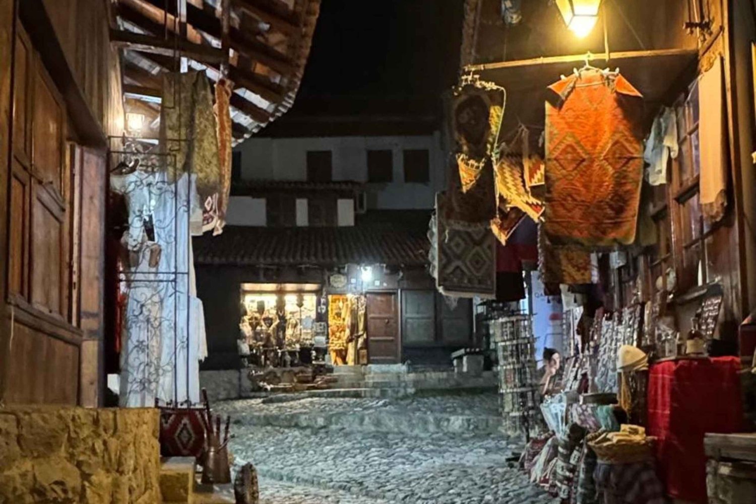 Oplev Krujas magi om natten! Udforsk det historiske slot og den oplyste gamle basar under aftenlysene, med færre mennesker og en unik atmosfære.