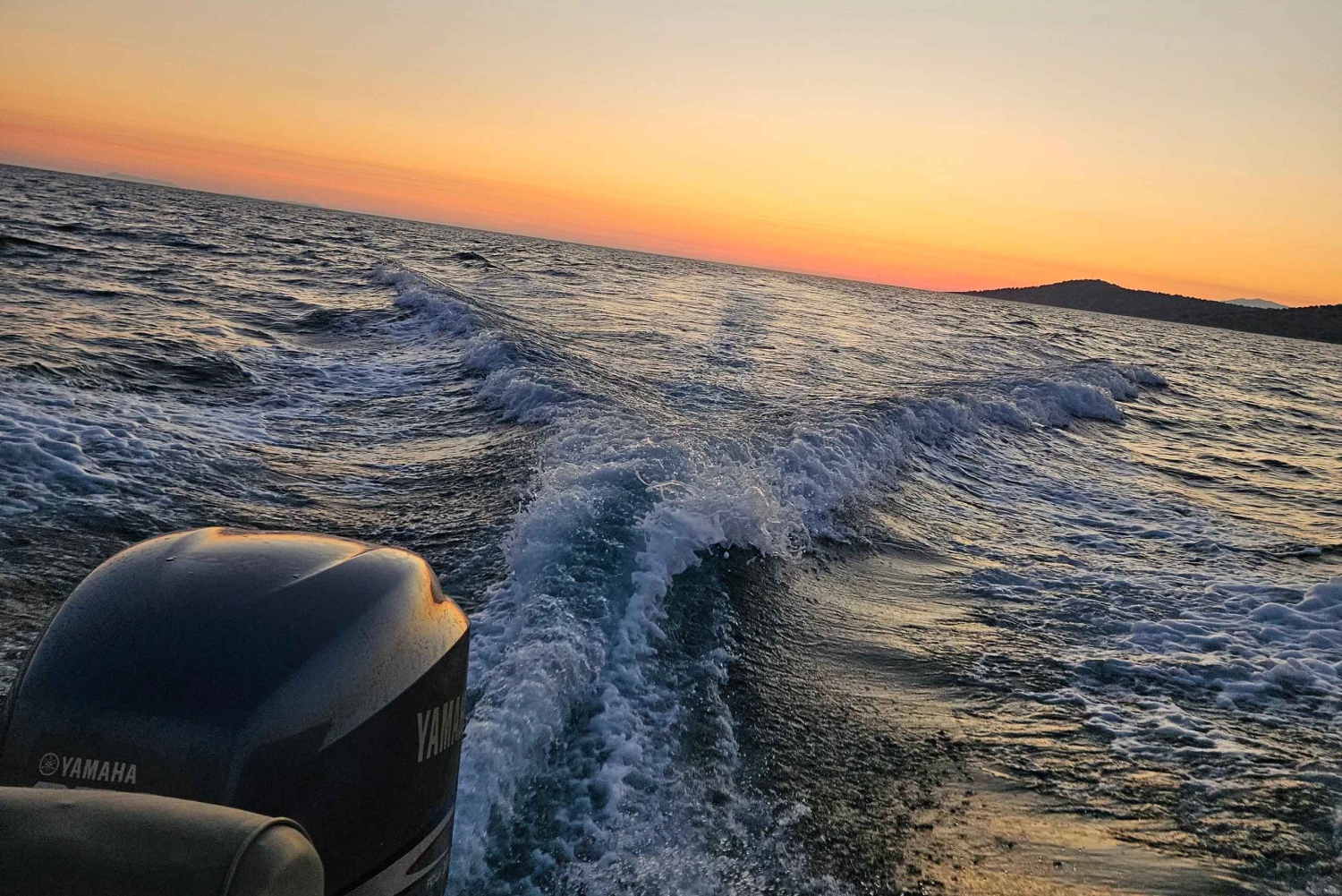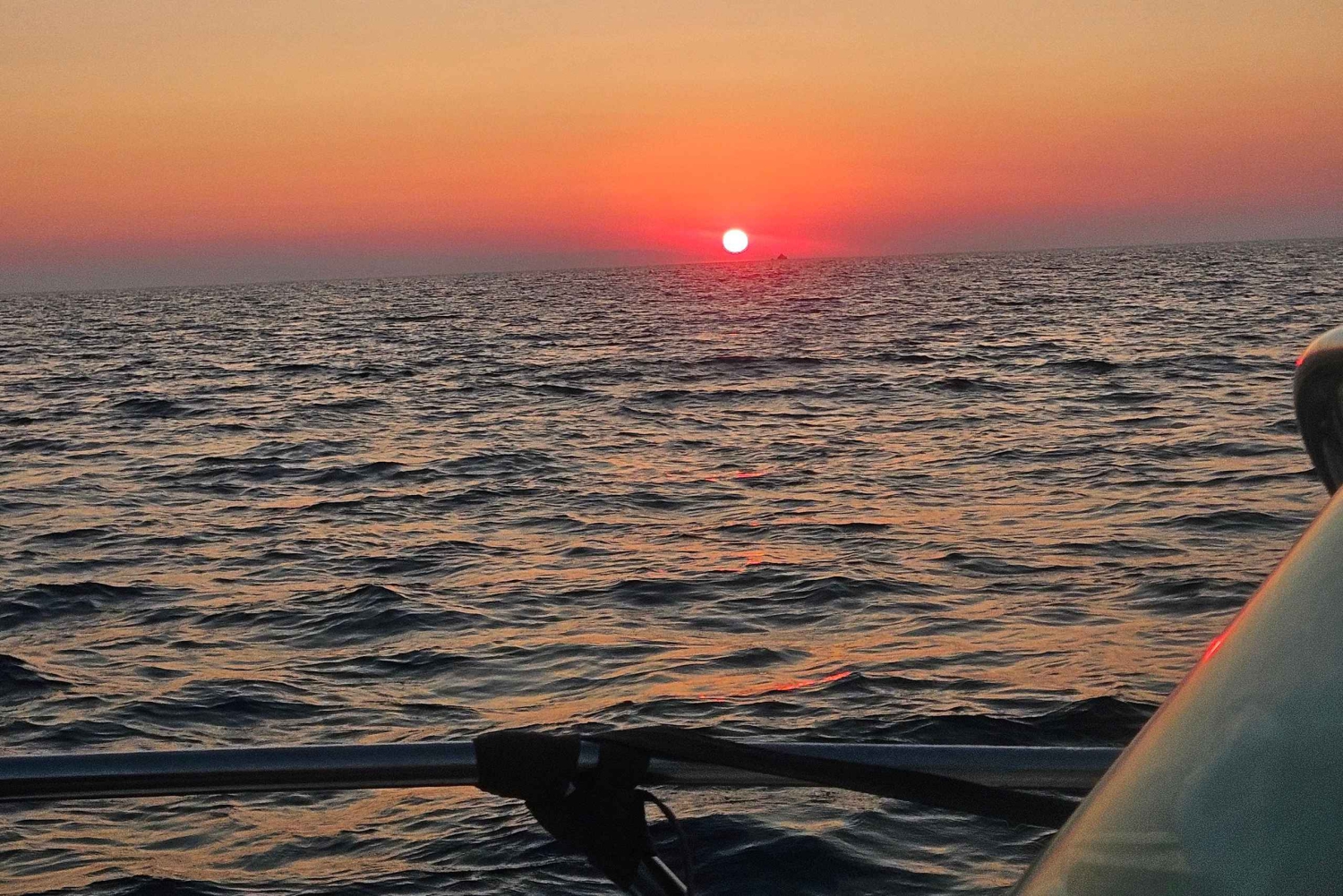 Erlebe den atemberaubenden Sonnenuntergang in Saranda bei einer entspannten Schnellbootfahrt entlang der ionischen Küste, wo leuchtende Farben den Himmel erfüllen. Genieße ruhige Momente und halte die herrliche Aussicht fest, während die Sonne untergeht.