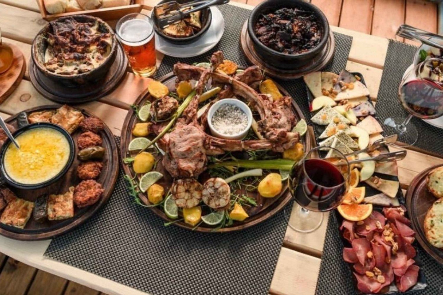Entspann dich nach der Stadtführung in einem traditionellen Garten in Shkodra, wo du ein authentisches albanisches Abendessen mit mehreren Gängen genießen kannst. Die Atmosphäre ist gemütlich und lokal und bietet einen echten Eindruck von der Gastfreundschaft Nordalbaniens.