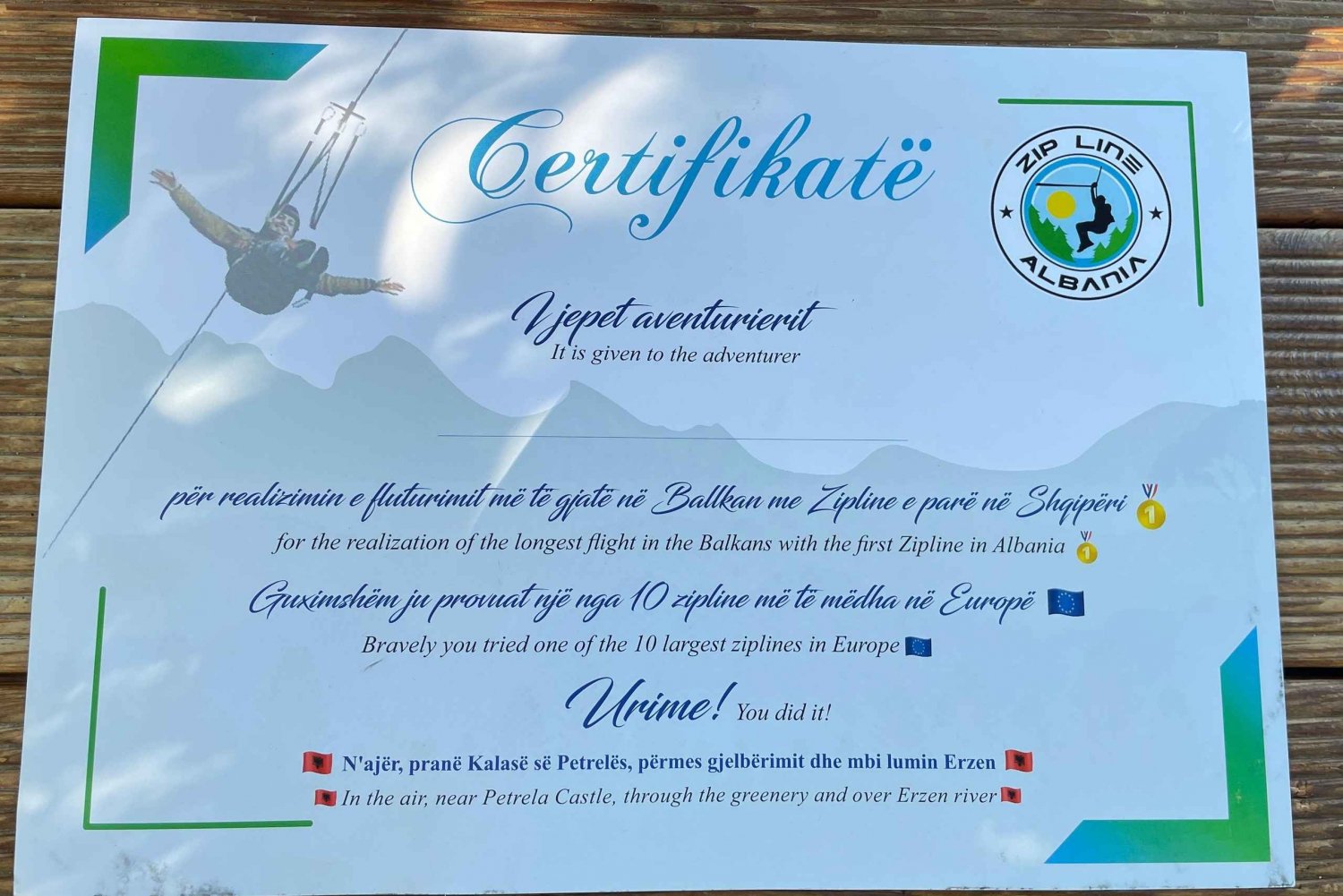 Erlebe den Nervenkitzel der längsten Zipline auf dem Balkan und erkunde die Burg Petrela auf einer geführten Tour. Genieße ein traditionelles albanisches Essen im charmanten Petrela Village.