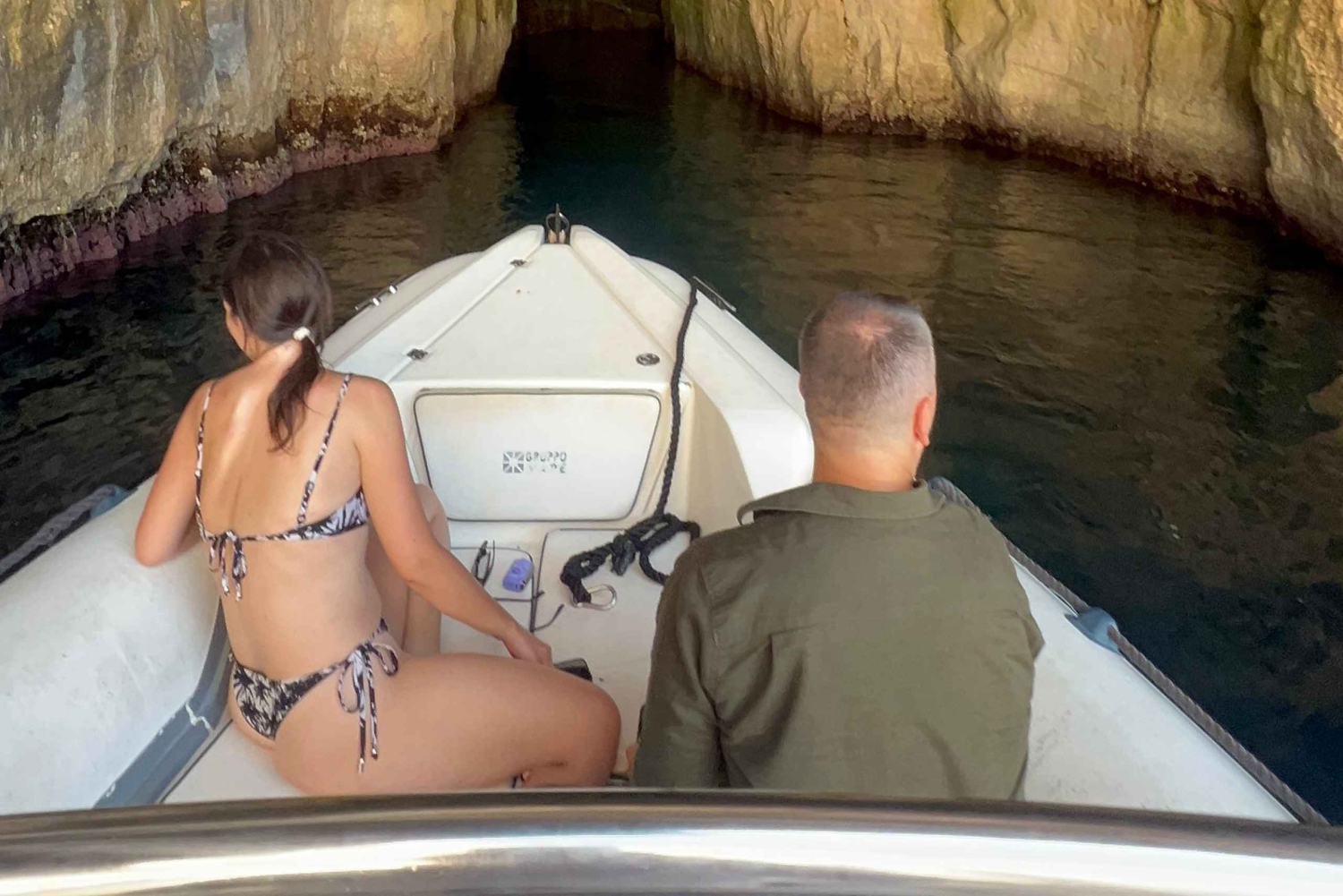Set off on an unforgettable speedboat adventure from Vlore and discover the hidden wonders of the Karaburun Peninsula, where wild nature meets the crystal-clear waters of the Ionian Sea. The journey begins at Dafina Bay and the enchanting Dafina Cave, a perfect combination of golden sand and a mysterious cave carved into the cliffs. The adventure continues to Bristarni Bay, a quiet and unspoiled spot ideal for swimming and enjoying pure nature.From there, you will explore the dramatic rock formations of the Secret Canyon, before heading to the scenic English Bay (Gjiri i Englezit), a historic and picturesque place with calm waters and beautiful views. Next, you will discover the magical Blue Gem Cave, where sunlight reflects in dazzling shades of blue, and the mystical Church Cave, known for the cross carved into its stone walls.The highlight of the trip is the iconic Grama Bay, one of Albania’s most famous beaches, where golden sands meet turquoise waters and ancient inscriptions can still be seen on the surrounding cliffs.