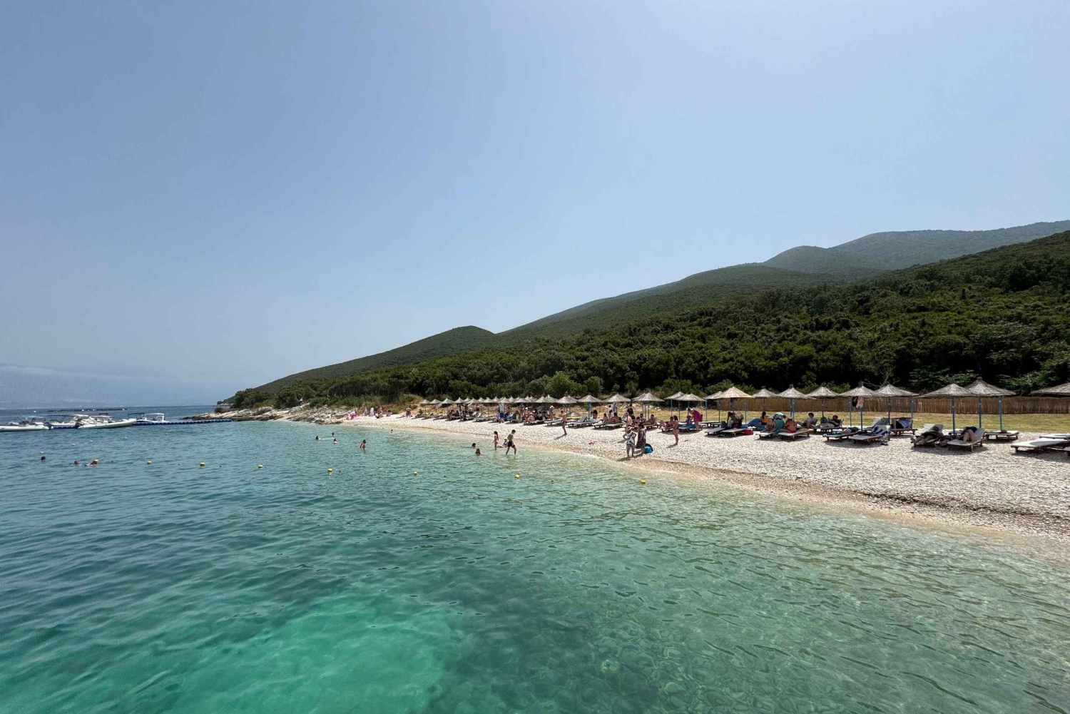 • Sazan Island is our first destination. Albania’s largest island, rich in history and wildlife, offers a unique experience. Hike through the mysterious old town uphill, exploring the old architecture and strategic points, or simply let nature unwind you. The island’s pristine beach invites you to swim, snorkel, or enjoy a refreshing drink with loved ones.