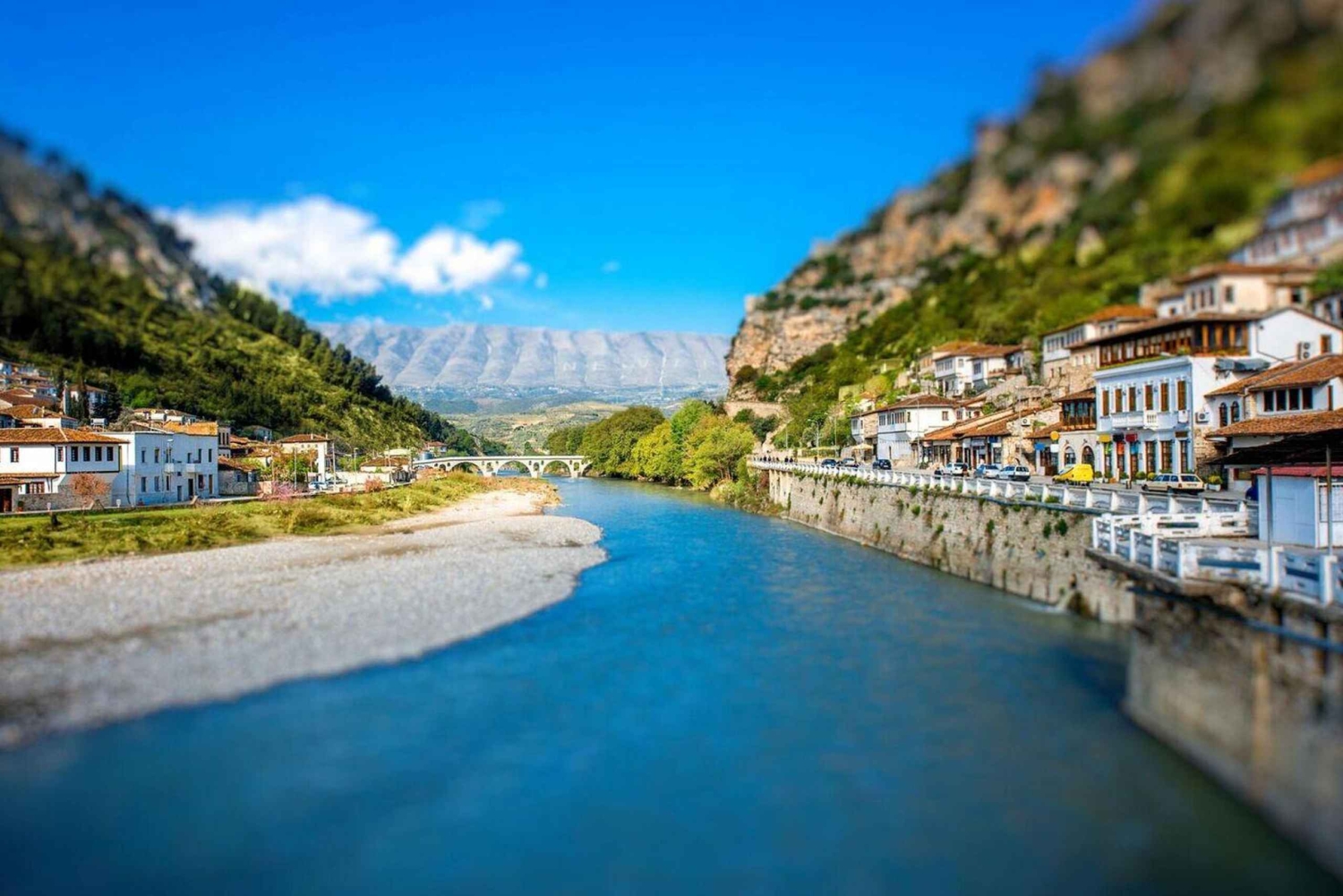 ティラナ発の日帰りツアーで、ベラト城とオヌフリ美術館をご探索ください。マンガレムで伝統的な昼食をお楽しみいただき、ゴリツァ地区を散策し、象徴的なゴリツァ橋を渡りましょう。