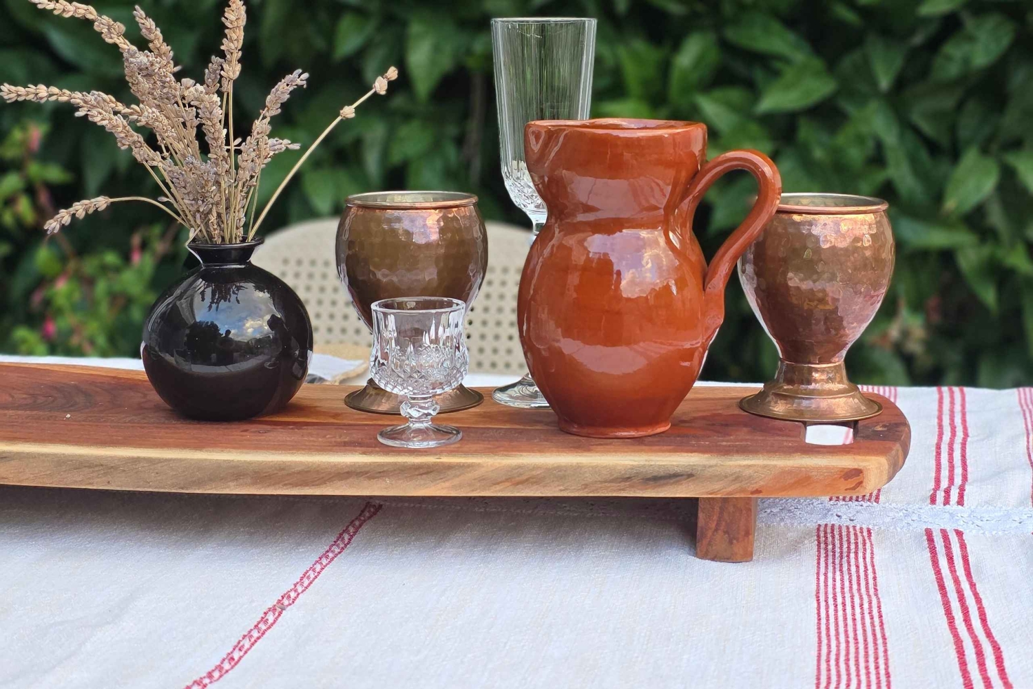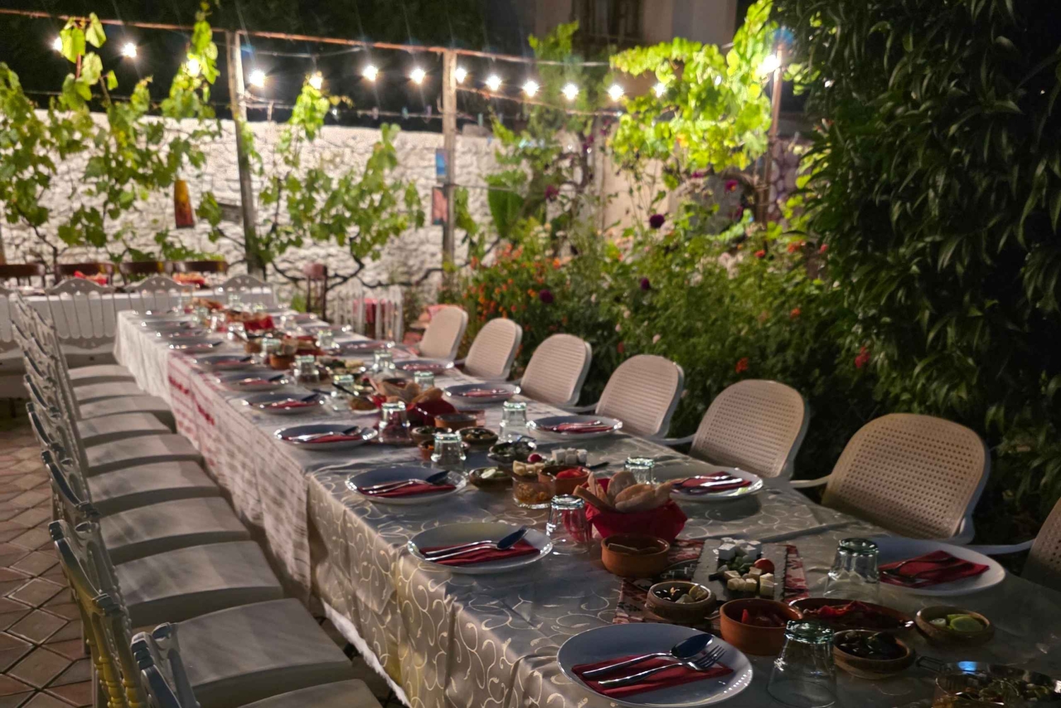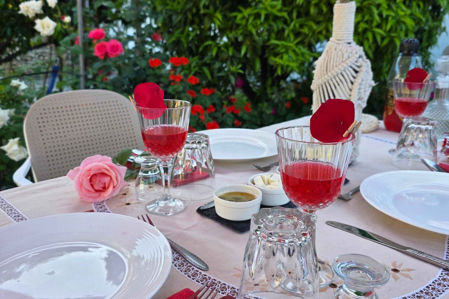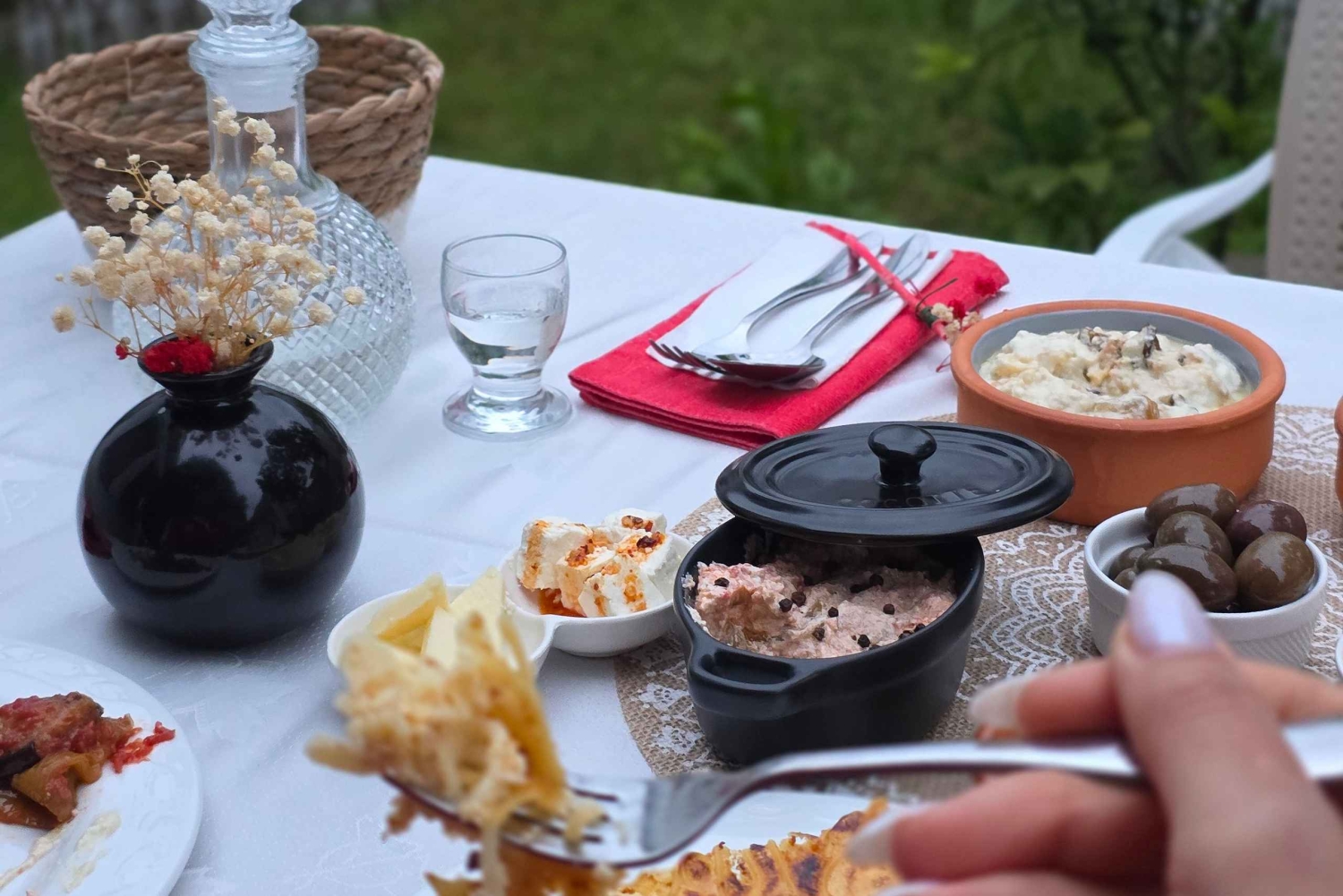 体験は、シュコダーの静かな庭園で始まります。家族のように温かく迎えられ、ブドウのつたの下に美しくセッティングされたテーブルで、愛情と伝統を込めて作られた手作りのディナーをお楽しみいただけます。料理に使用される野菜とハーブはすべて100%オーガニックで、ご自宅の庭で栽培されたものです。ラキも自家製で、代々受け継がれる伝統的な製法で丁寧に蒸留されています。
