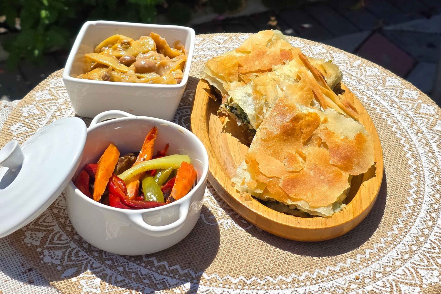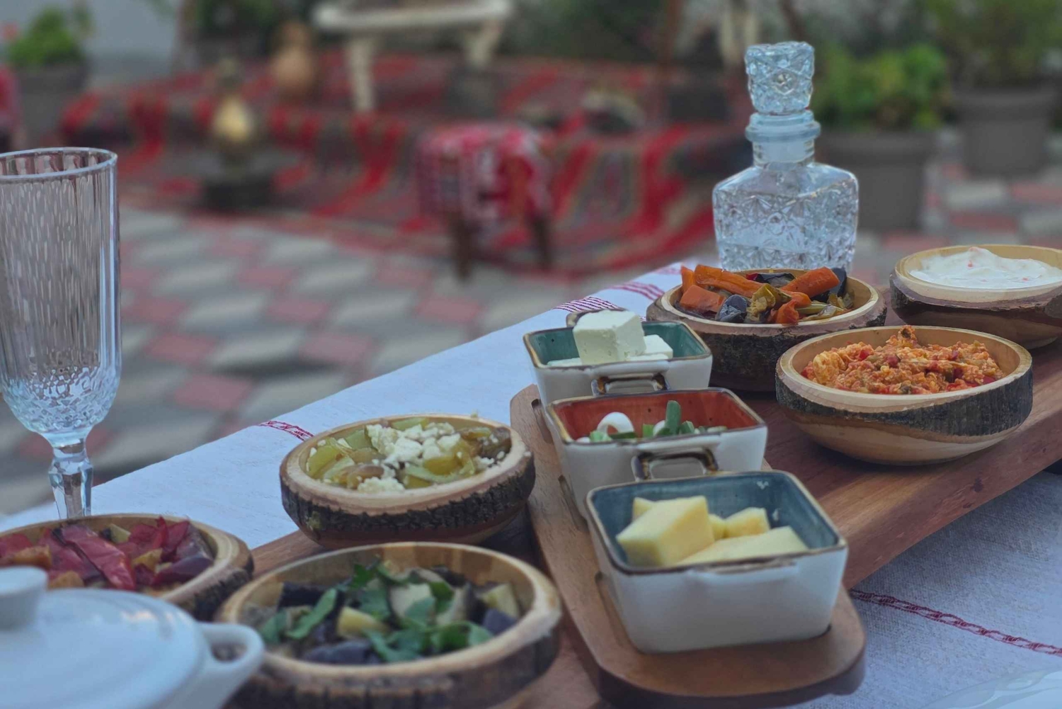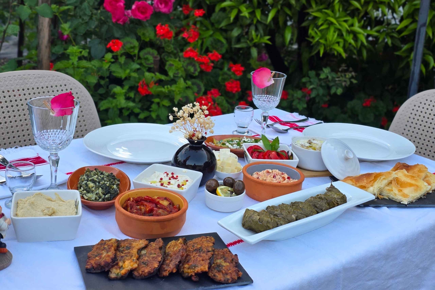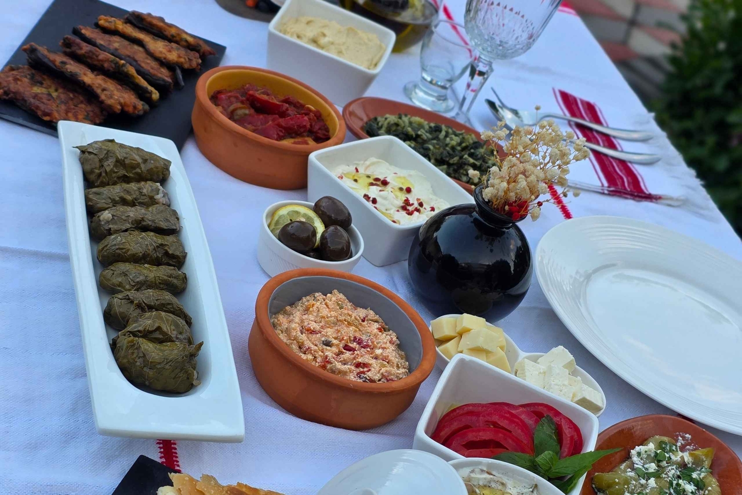 食事は、新鮮な白チーズ、オリーブ、ローストしたピーマン、手作りのパンからなるメゼの盛り合わせから始まります。続いてメインコースが登場します。ビレック、ジャプラク、近くの湖で獲れた魚、または季節の野菜と共にオーブンで焼いた肉など、クラシックな料理が日替わりで楽しめます。最後に、カダイフや手作りのフルーツジャムなど、伝統的なデザートで締めくくります。