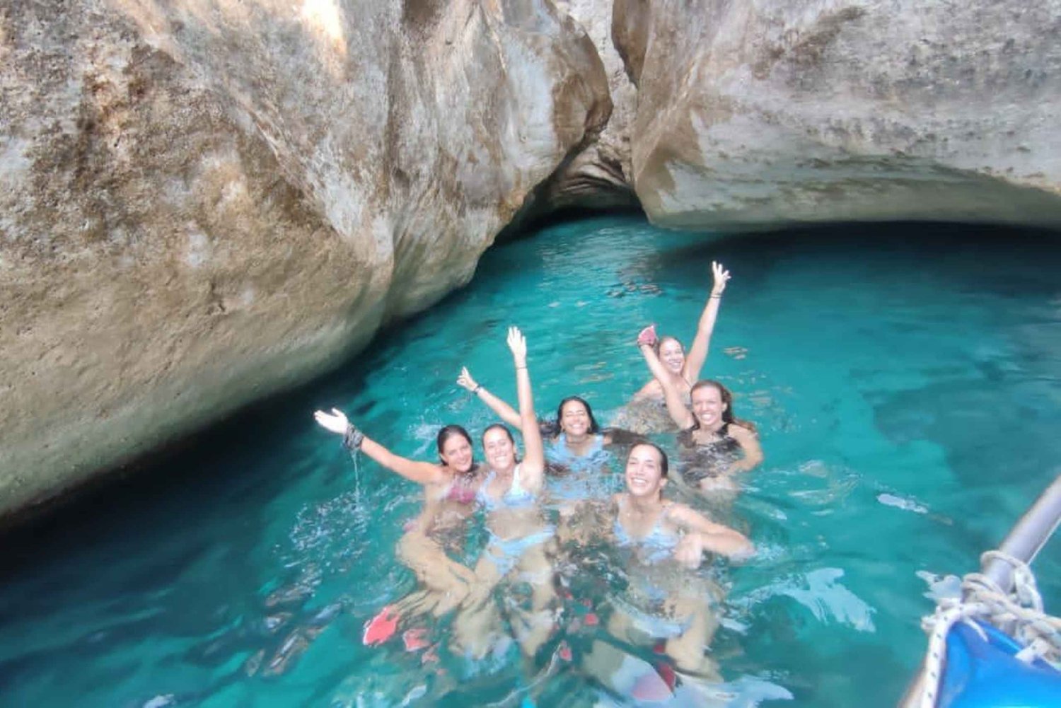 Snorkelliefhebbers zullen zich in een onderwaterwereld wanen en het diverse onderwaterleven ontdekken dat Grama Bay zijn thuis noemt. De helderheid van het water zorgt voor zichtbaarheid tot op de zandbodem, wat de ervaring van het verkennen van dit kustecosysteem vergroot. Dit is ook een mooie gelegenheid voor onderwaterfotografie, dus zorg ervoor dat je dit niet mist! De baai van Gramma is de laatste zwemstop van de cruise. Een tegenstrijdig landschap met groenachtige rotsen en bijna transparant ondiep water zal je het komende uur betoveren, terwijl je geniet van zwemmen en momenten van ontspanning.