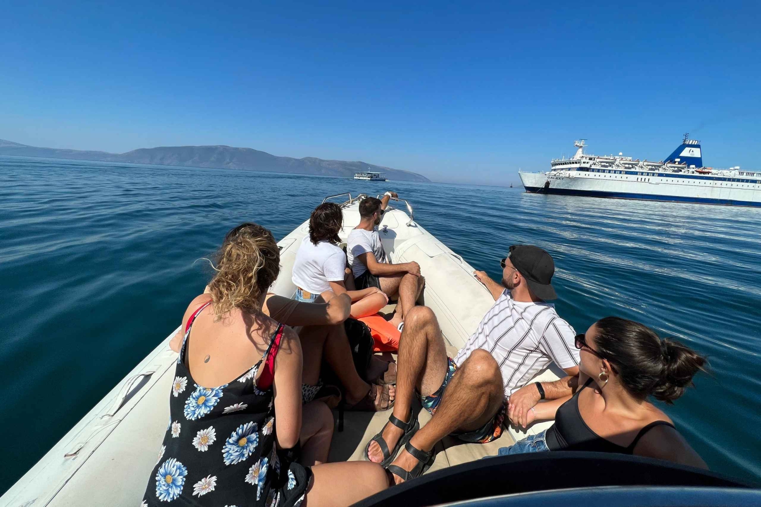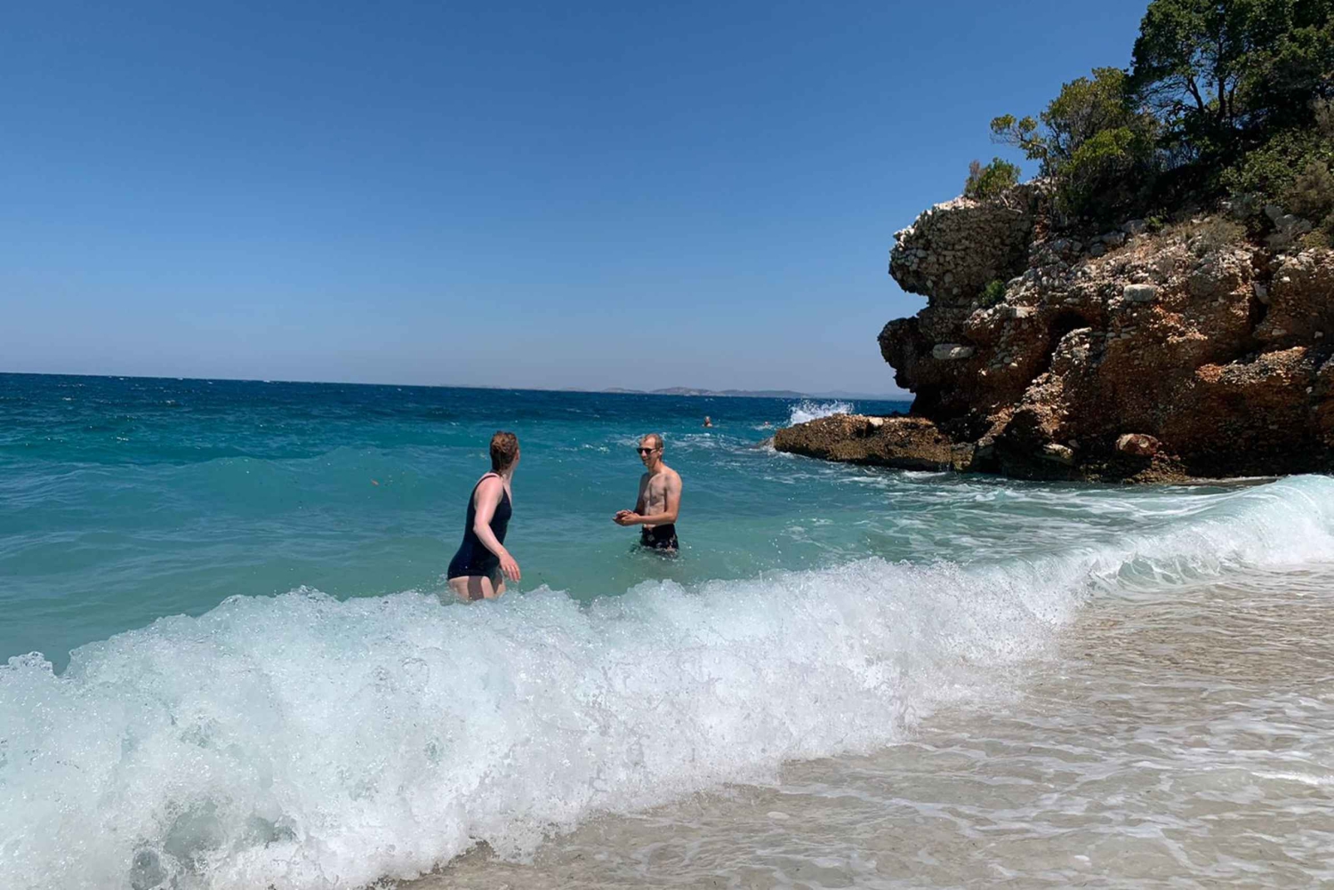 Første stopp: Haxhi Ali-hulen (30 minutters kjøretur). Snorkle inne i hulen og utforsk det krystallklare vannet. Gratis snorkleutstyr er tilgjengelig. Deretter seiler du langs kysten og stopper ved skjulte bukter og klipper. Du kan hoppe i vannet, svømme eller slappe av med en gratis vannflaske om bord. Siste stopp er en bortgjemt strand på Karaburun-halvøya. Du har 1,5 time fri tid til å svømme, sole deg eller kjøpe lokal mat og drikke på en liten taverna (vær oppmerksom på at du kun kan betale kontant på tavernaen). Retur: 20–30 minutters kjøretur tilbake til Orikum Marina Port. Med et lite antall deltakere tilbyr denne turen en avslappet, intim og uforglemmelig opplevelse!