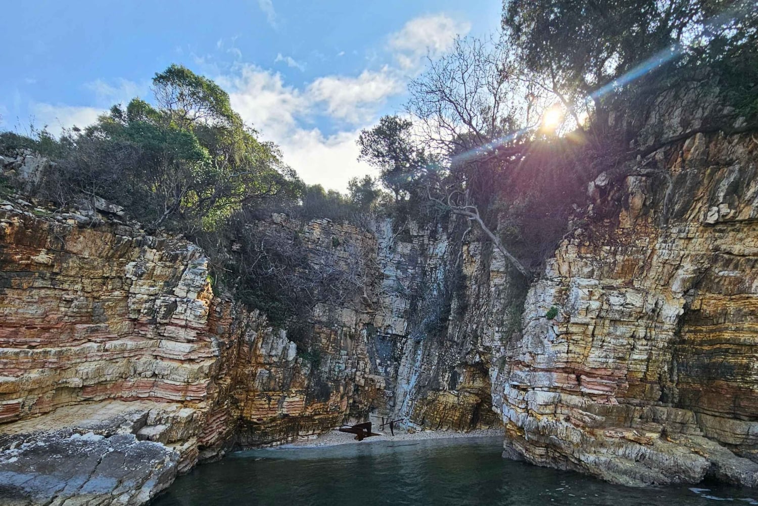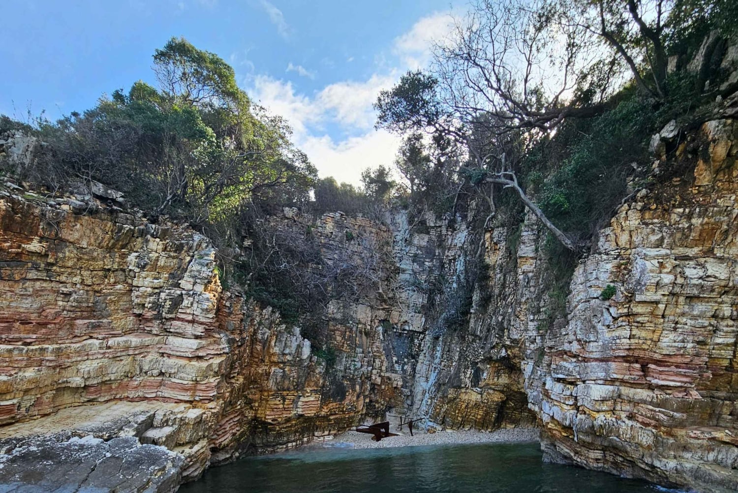 Deretter ankommer du Kroreza-bukten, hoveddestinasjonen. Her har du god tid til å slappe av på stranden, svømme i turkisblått vann eller nyte lunsj på strandrestauranten. Med solsenger og parasoller tilgjengelig er dette det perfekte stedet for å lade batteriene og nyte skjønnheten ved den joniske kysten.