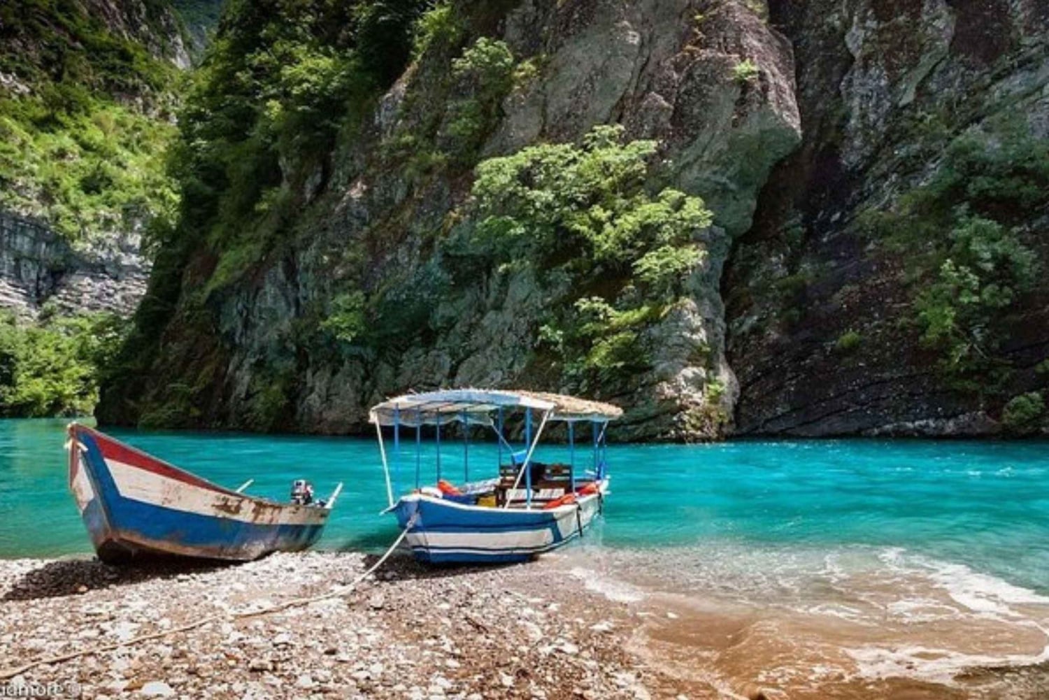 Anländer till Komani Lake-piren och går ombord på en båt som glider över smaragdfärgade vatten, vilket ger dig chansen att beundra de gröna landskapsarkitekterna som omger dig från vattenperspektivet. Anländer till Shala-floden som har kristallklart vatten som matas av de albanska alperna.