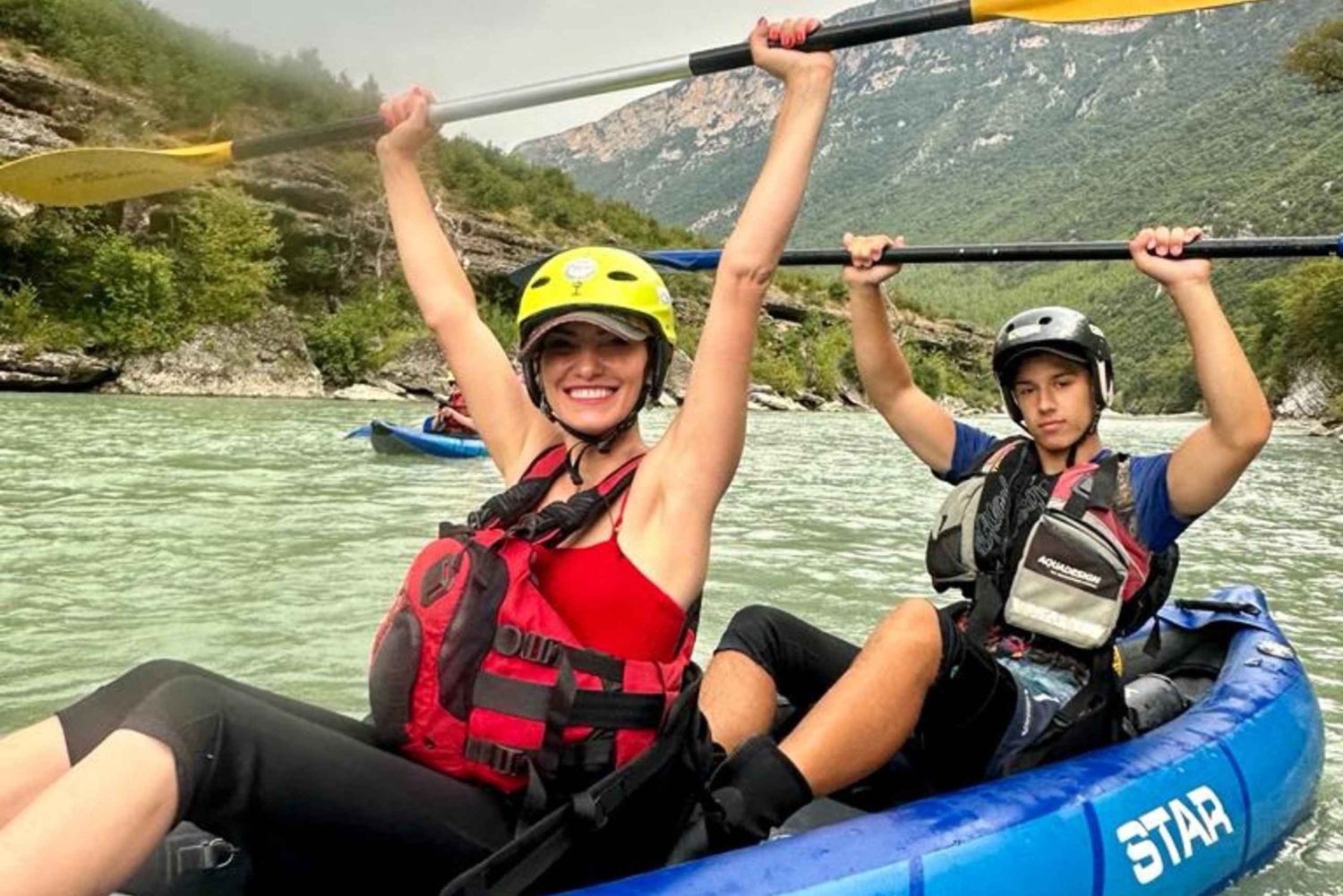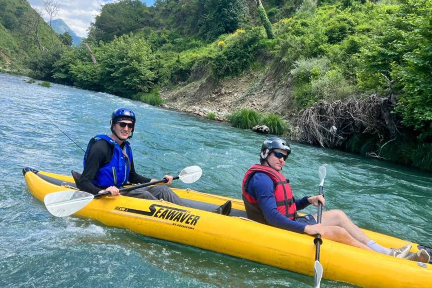Vår kajakresa i Tepelenë äger rum i en av de vackraste delarna av floden Vjosa, den sista vilda floden i Europa. Vi börjar från Kelcyras klyfta i södra Albanien som skapats av Vjosa-floden, nära staden Kelcyre. Klyftan har panoramautsikt och avkopplande vyer, under resan kommer vi att njuta av 'Black Water' som har en vattenkälla och naturfenomen som inträffar. Vi trampar genom kanjonen och vattenfallen i ca 2 timmar tills vi kommer fram till byn Peshtan.